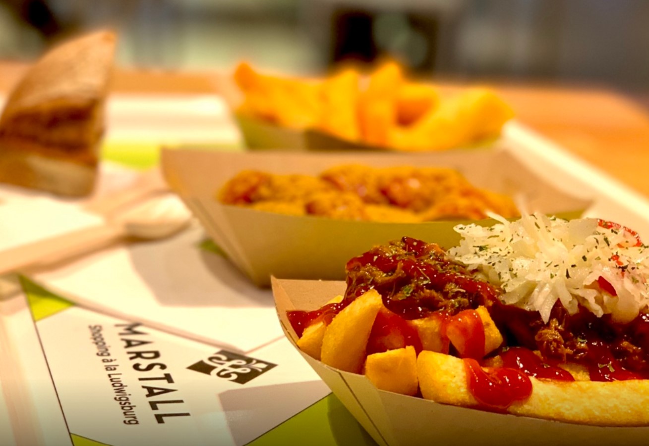 Hähnchenspieß mit Pommes oder Reis im Teller